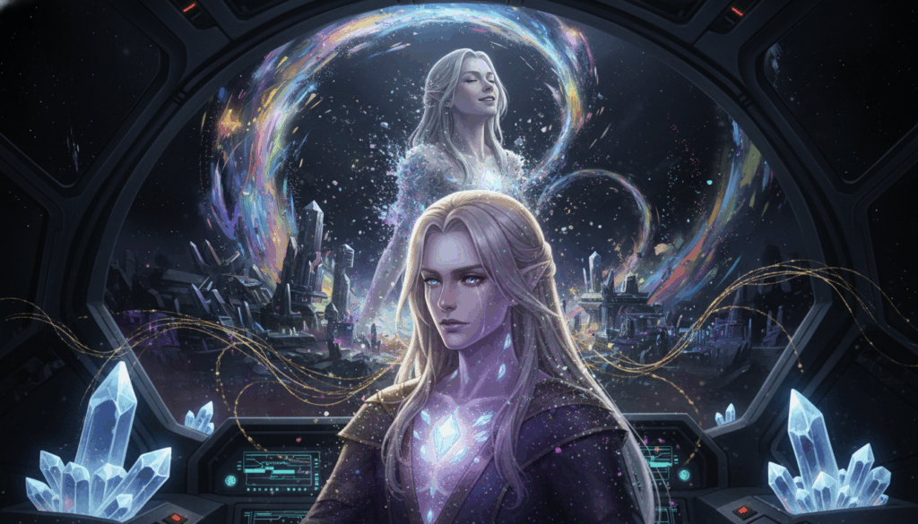 七つの人工太陽が創り出す虹色の光に包まれた、美しい惑星の光景が蘇る。ヴェリディアンの首都星は、まさに宇宙の宝石と呼ぶにふさわしい世界だった。建造物はすべて生きたクリスタルで構成され、住民の感情に応じて色彩を変える。街角では常に音楽が流れ、それは個人の心の歌が自然に調和して生まれる「星辰の歌」だった。